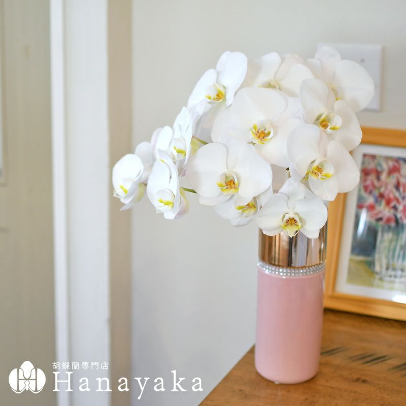 コンパクトながら上品な美しさを持つミディ胡蝶蘭を、センスよく束ねました。