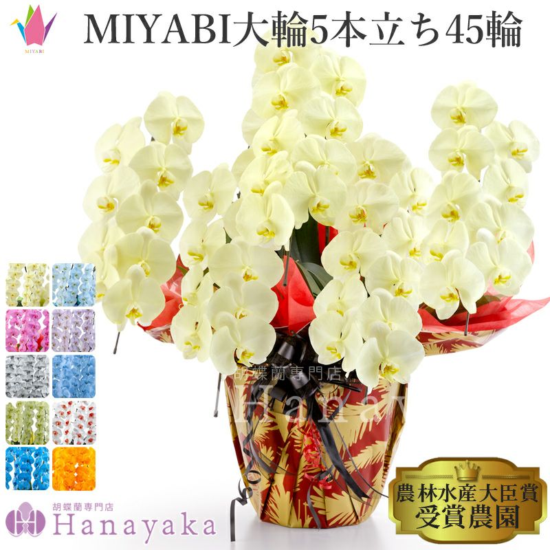 青い胡蝶蘭 オレンジ 緑 黄色 紫 ブルー パープル 彩り豊富な胡蝶蘭 MIYABI 大輪5本立ち 45輪以上