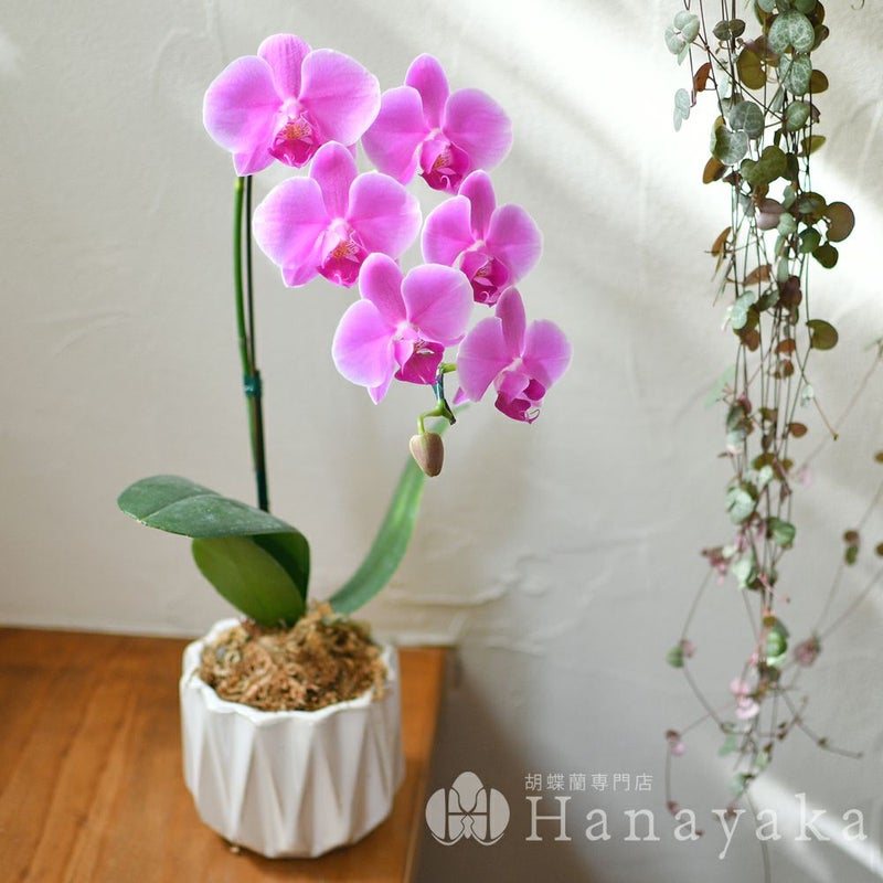商品説明 デザイン鉢がおしゃれ。小さな花弁が可愛いミディ胡蝶蘭。